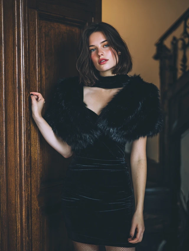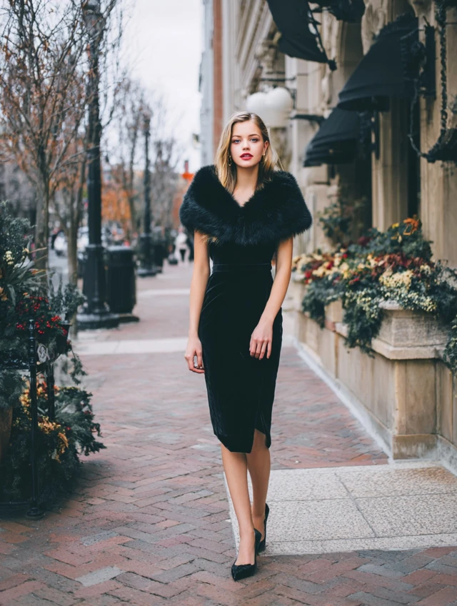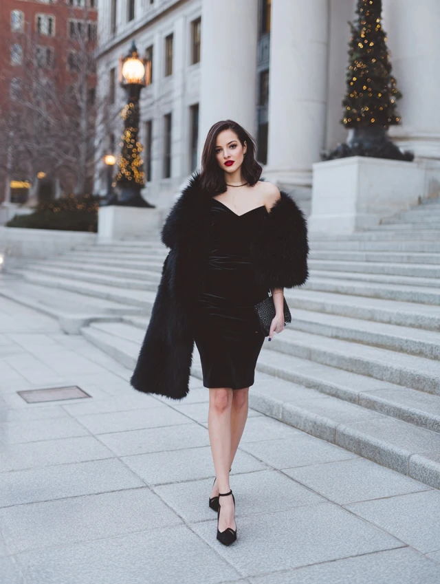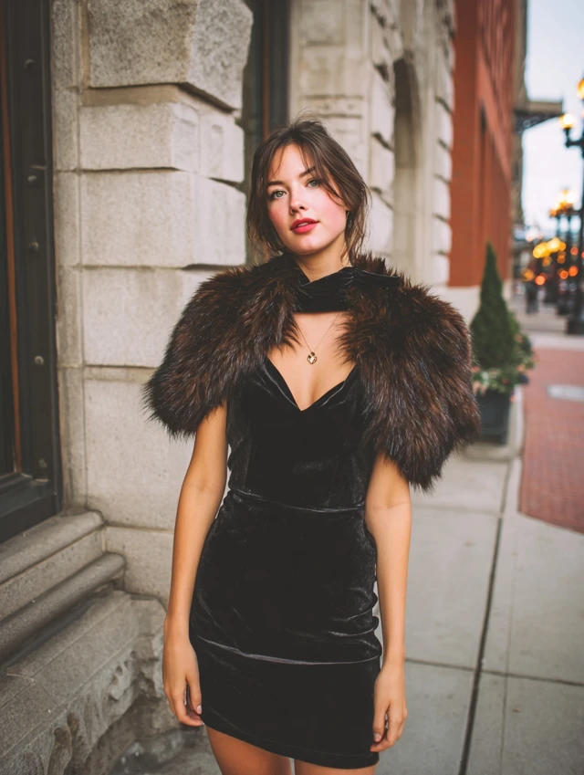 • Layers: Blazers, shawls, or faux fur wraps for drama.