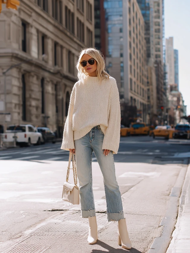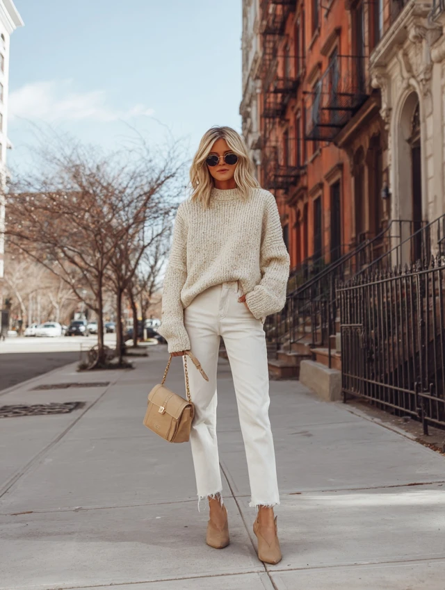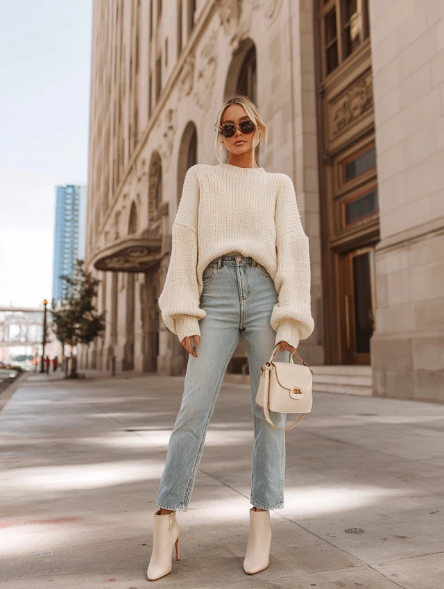 1. Oversized Cream Sweater + Straight-Leg Jeans